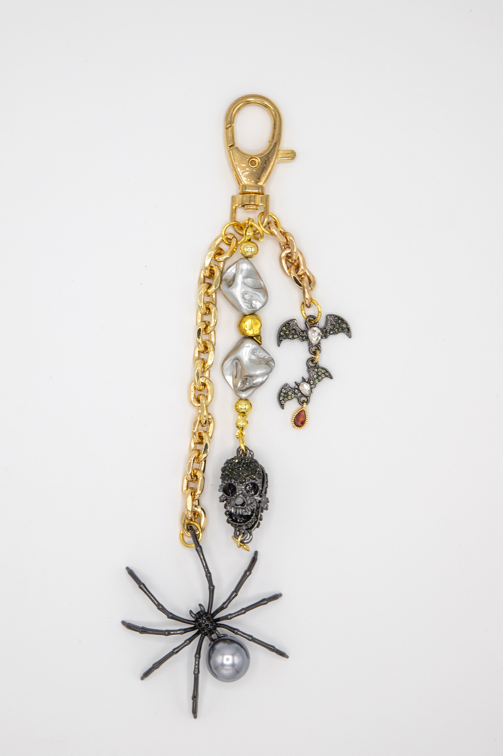 The Webbed Up Bag Chain blends gothic luxury with playful elegance. Featuring a large black spider adorned with a pearl, a bold CZ skull, and delicate bats, all set against gleaming gold-toned hardware, this accessory adds a midnight-chic edge to any look. Perfect for those who love a little bite with their style.