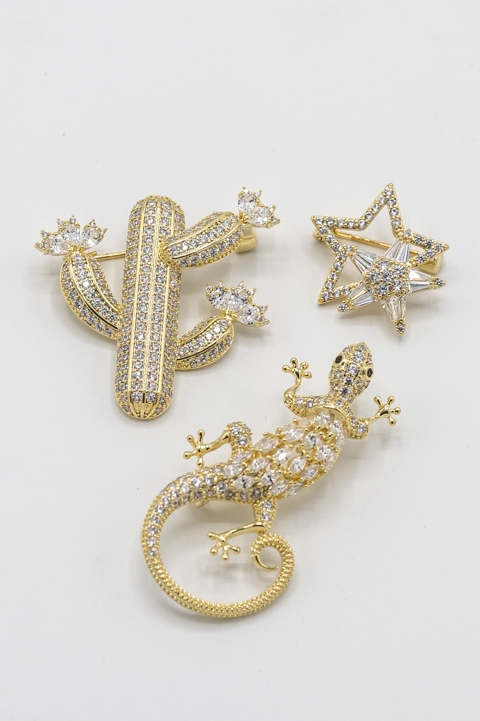Add a touch of desert charm to your look with this playful gold-toned brooch set featuring a sparkling gecko, cactus, and star. Perfect for adding a bit of glam and whimsy, these dazzling accents bring a sunny sparkle twist to any outfit.
