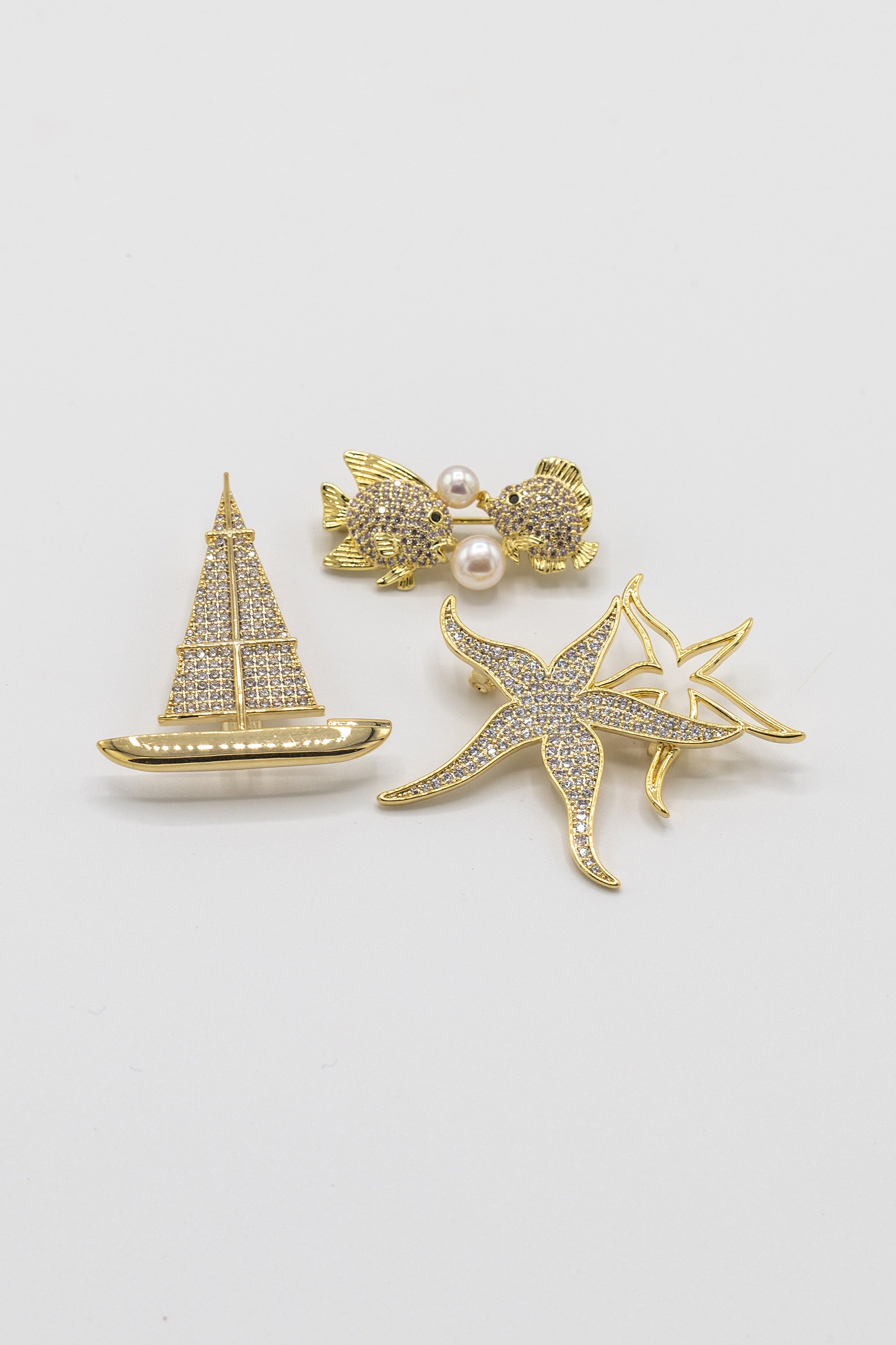 Add a splash of seaside charm with the Starfish Kisses Brooch Set. Featuring a ship, starfish, pearly fish, and sparkling CZ accents in a warm gold tone, this set captures playful ocean glam with a pastel pin-up vibe. Perfect for adding a touch of whimsical elegance to any outfit, these brooches bring the magic of the sea right to your style.