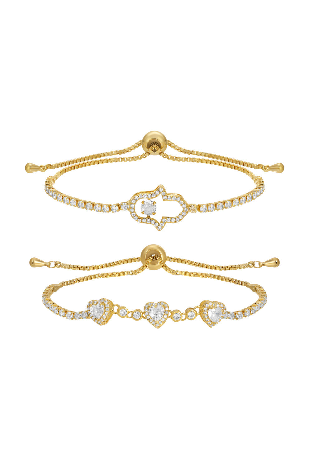 The Arshina 2-Piece CZ Hamsa Bolo Bracelet Set combines hamsa and heart accents for a radiant, meaningful touch to everyday style. This set effortlessly adds elegance and a hint of symbolism to any look.