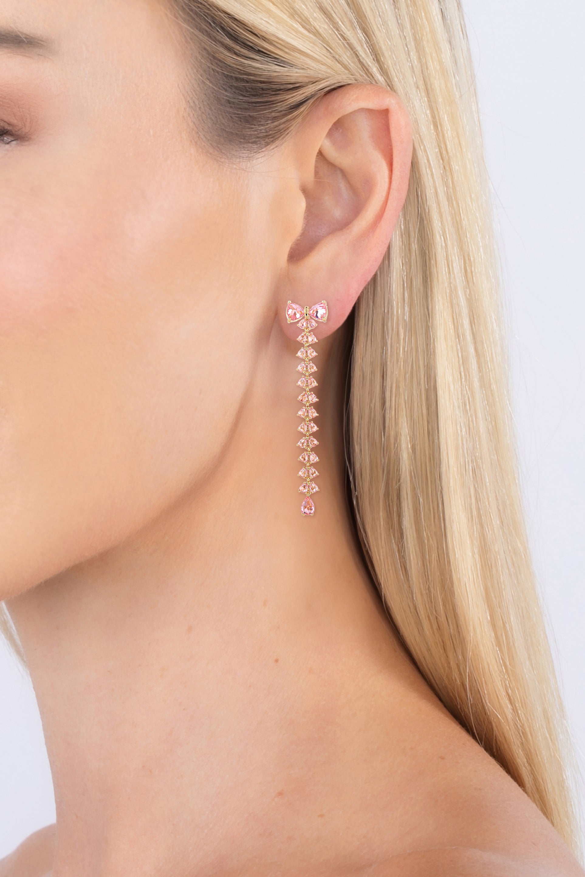 Garner a new glamourous look with these bright pink bow earrings! These bow earrings boast shining pink zirconia crystals that are further complimented by a gold brass base to really let their beauty shine through. Pair these long earrings with a gold necklace to complete the jewelry set!
