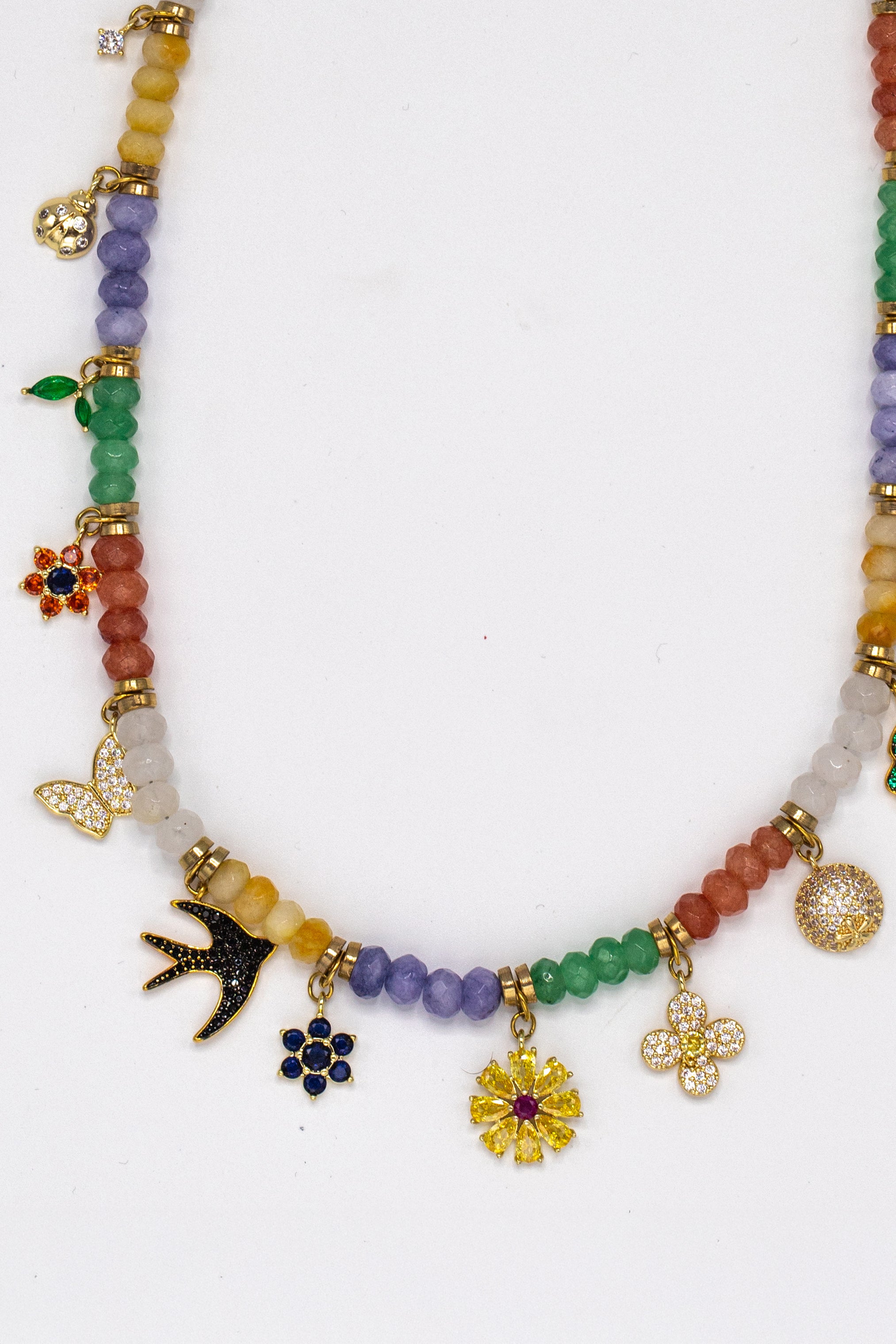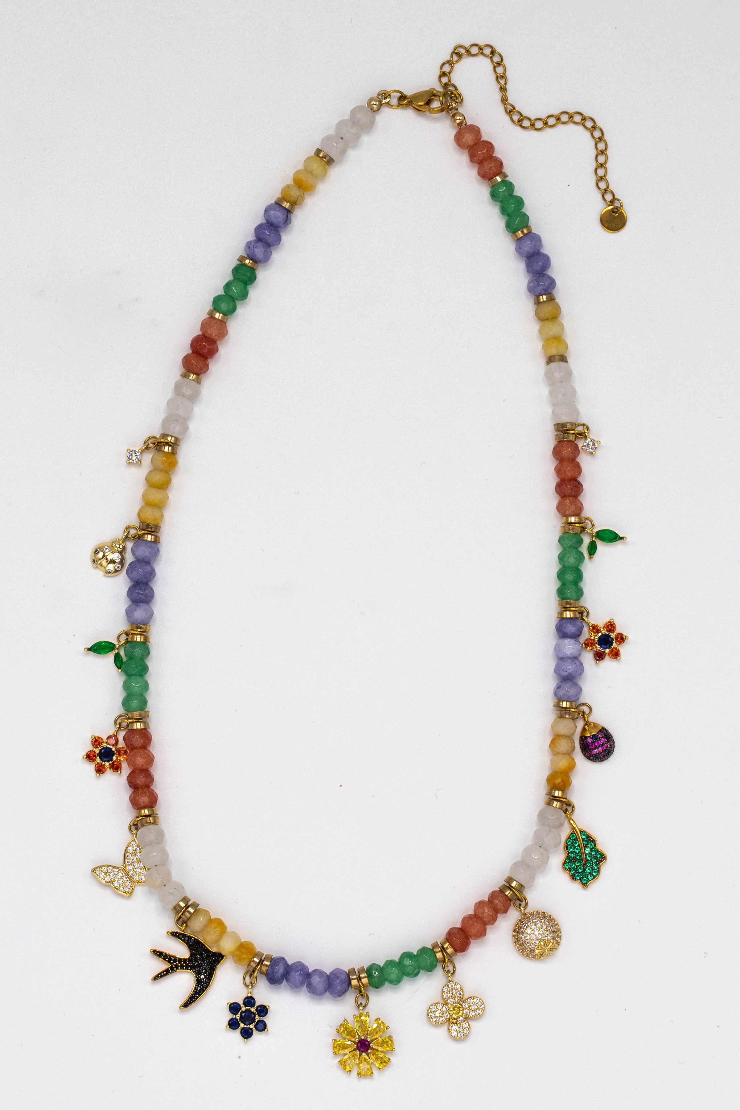This playful necklace bursts with color and charm, featuring faceted beads in a lively rainbow palette, sunny yellows, soothing purples, earthy greens, soft whites, and warm corals, each accented by delicate gold-toned spacers. Hanging from the strand, whimsical gold charms like jeweled flowers, a sparkling butterfly, a black cz bird, and celestial icons add personality and sparkle. Perfect for brightening any outfit, this joyful piece is a cheerful celebration of color and character.