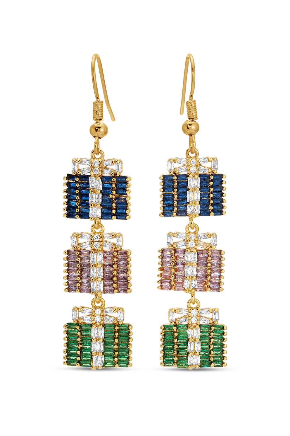 Celebrate the season with the Anna Gift CZ Drop Earrings. These dangles feature three gift-wrapped boxes made with vibrant blue, pink, and green cubic zirconia stones. Perfect for holiday parties or as a sparkling stocking stuffer, these charming present earrings capture the festive spirit with style.