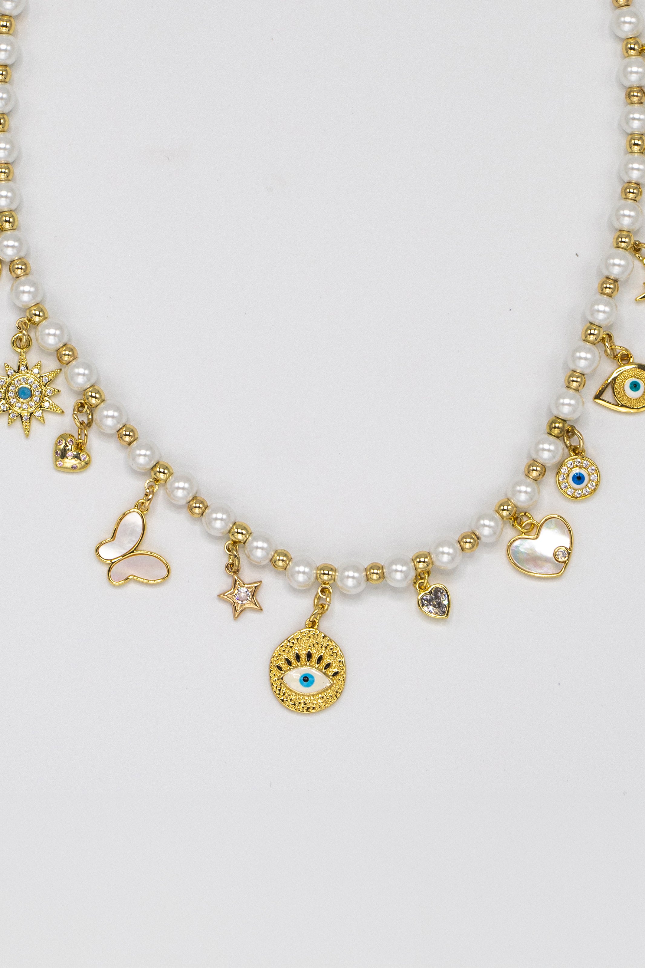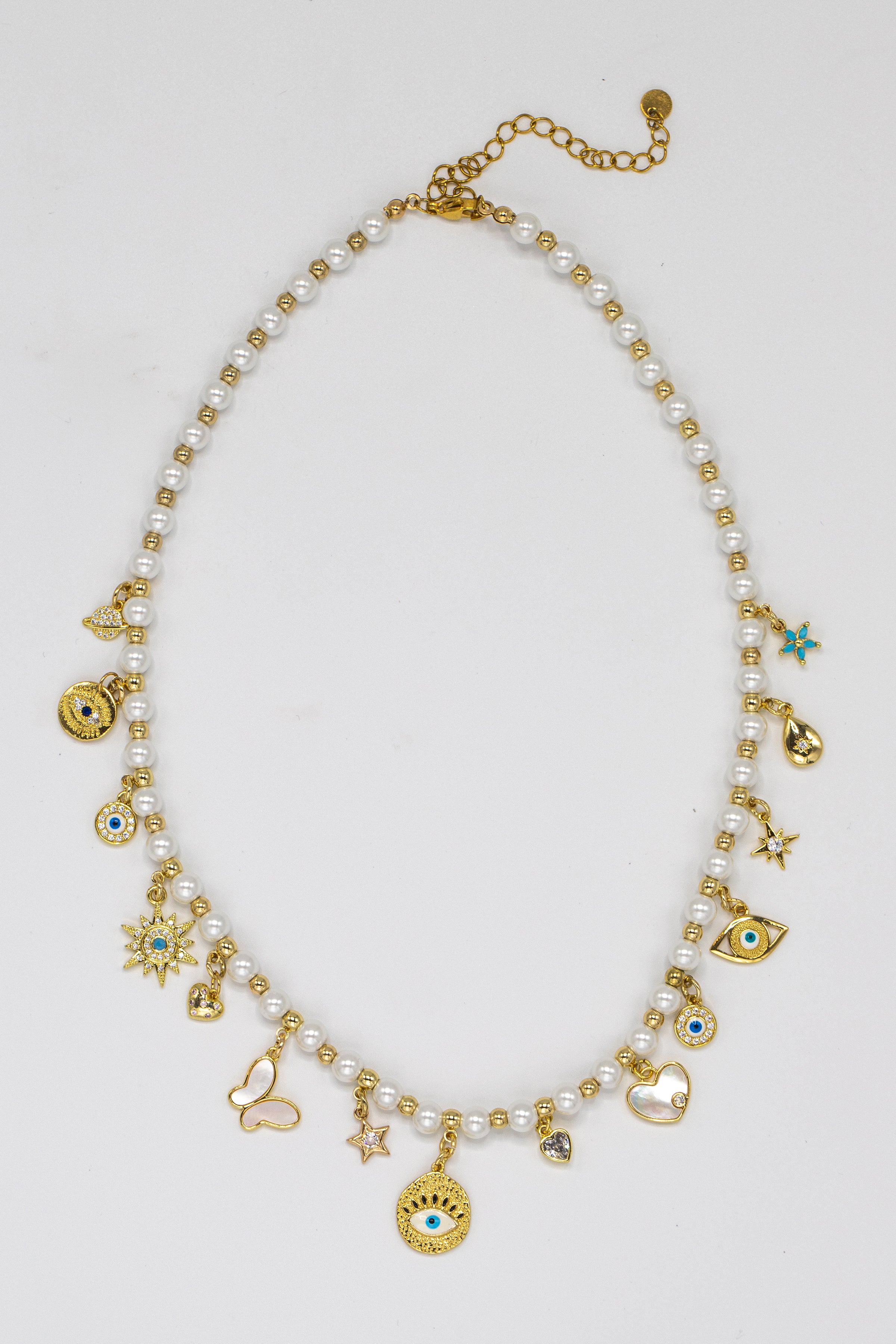 The Aura Watcher Necklace is a playful blend of charm and magic. Featuring shimmering shell pearls and gleaming gold accents, it’s decorated with whimsical evil eyes, hearts, stars, and sunbursts that add a touch of protective sparkle. At its center, a bold golden eye medallion acts as a stylish talisman, inviting intuition and clarity into your everyday look. Perfect for adding a little extra sparkle and good vibes wherever you go!