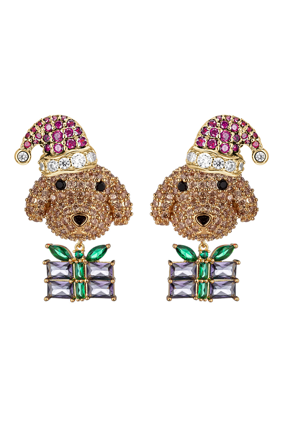 These festive earrings feature a sparkling puppy wearing a holiday hat and holding a wrapped gift, designed with CZ accents for a bright seasonal look. Lightweight and eye-catching, they’re perfect for adding a cheerful touch to any holiday outfit.