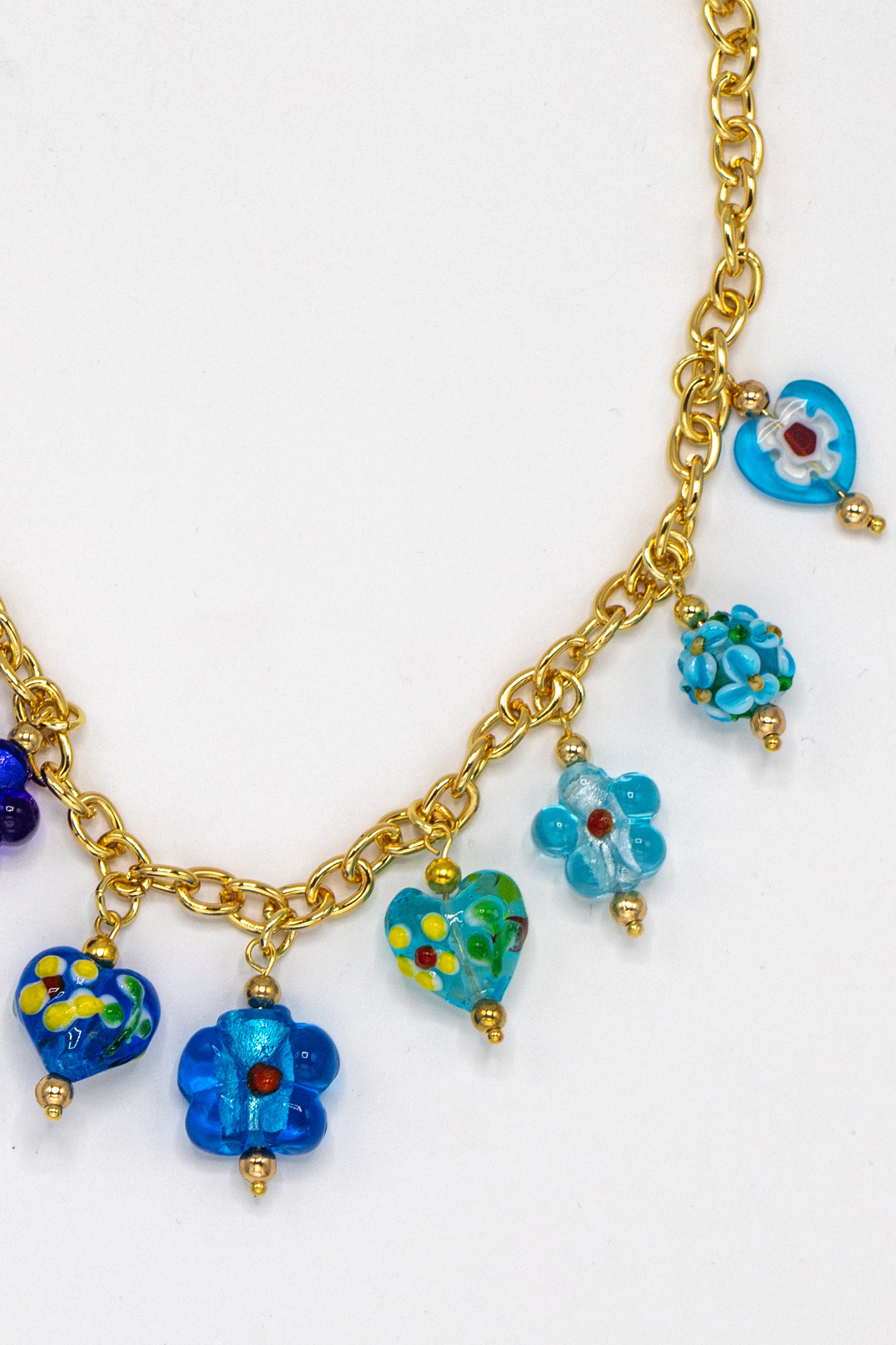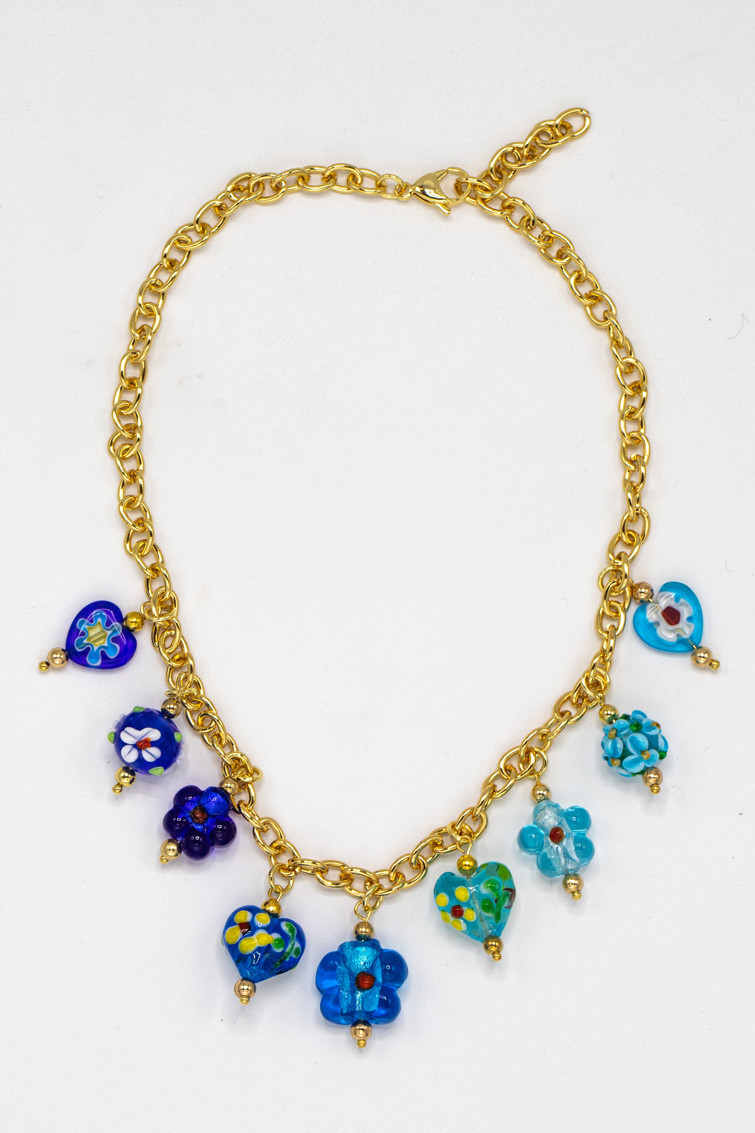 This playful statement necklace captures garden party charm with a retro flair. A chunky gold toned chain is decorated with handblown millefiori-style glass flowers and heart charms in dreamy blues, turquoise, and violet. Each unique bloom adds personality, creating a wearable bouquet that dances with every move. Perfect for adding a bold, fun touch to any outfit.