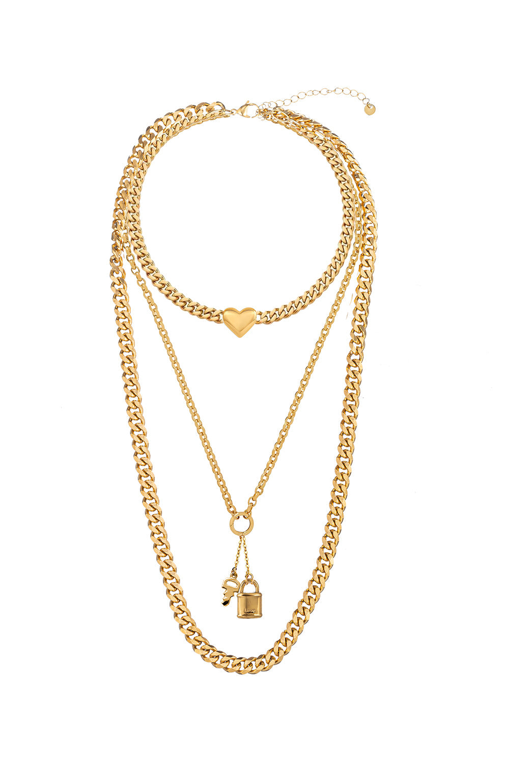Make a bold statement with the Jasmine 18K Gold Plated 3-Tier Drop Necklace, featuring three necklaces in one. This striking piece includes a heart pendant collar, a chain necklace with lock and key charms, and a Cuban chain, all in a luxurious golden tone. Perfect for adding a touch of character to your everyday look.