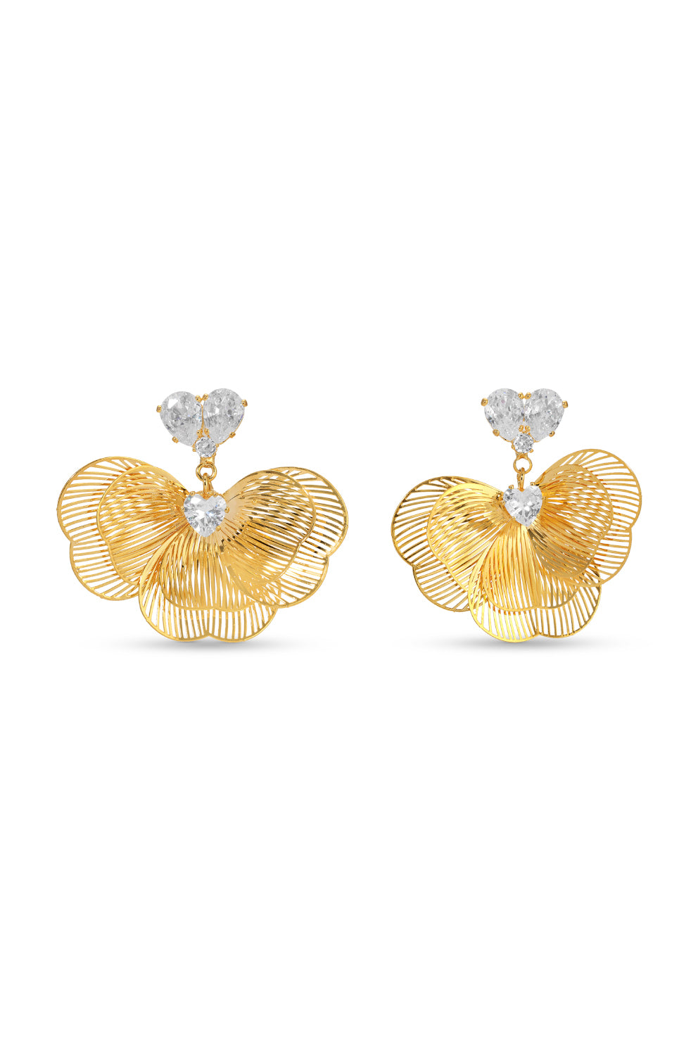 The Peggy Flower Petal Drop Earrings feature radiant heart-shaped crystal studs with golden shutter flower petals, creating an ornate and classy statement. Perfect for adding floral elegance to any look, these earrings bring a touch of sophistication and charm.