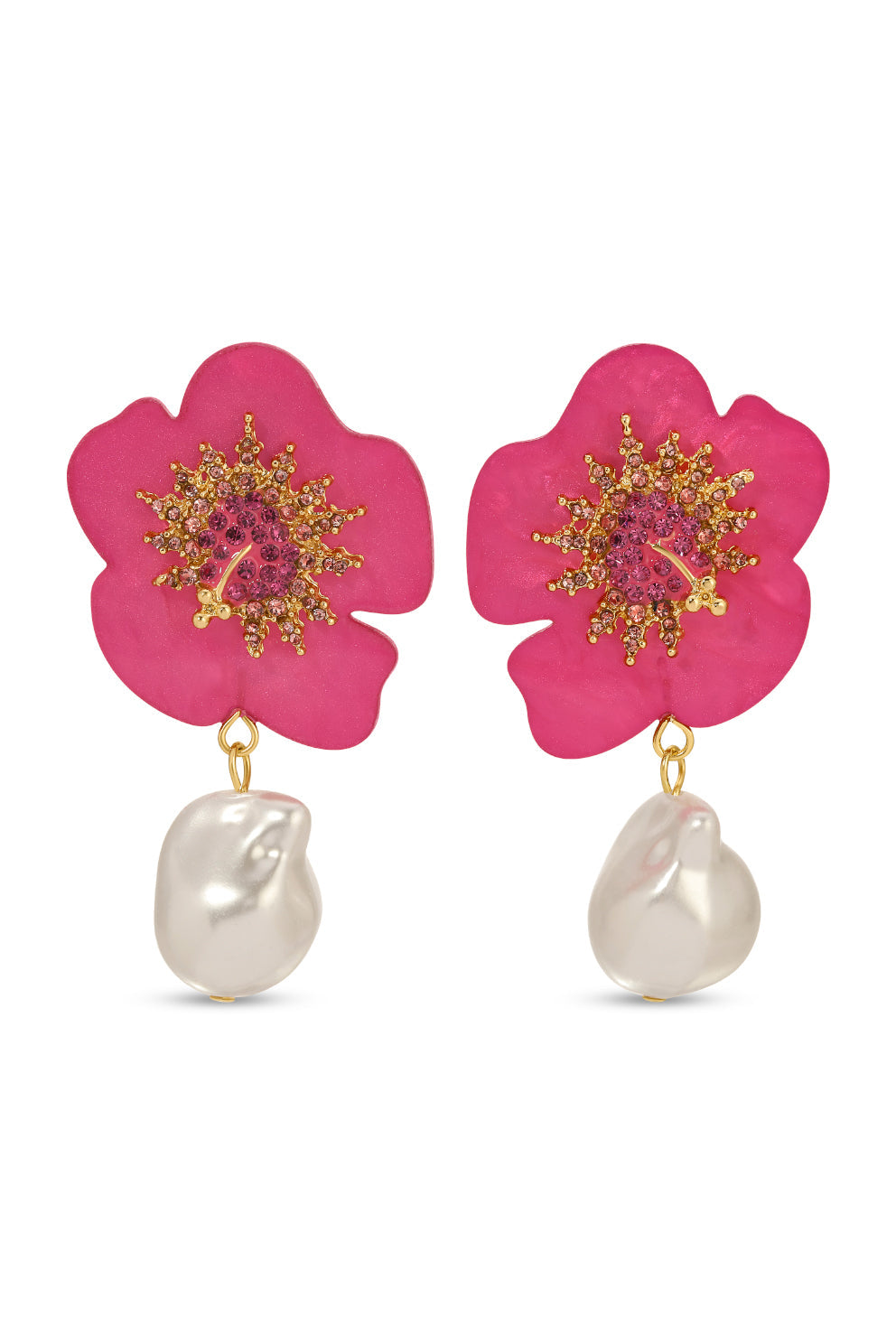 The Ruby Flower Pearl Drop Earrings feature a large pink flower paired with a baroque pearl drop, creating an ornate statement piece. These earrings bring a unique blend of charm and sophistication, perfect for adding elegance to everyday looks.