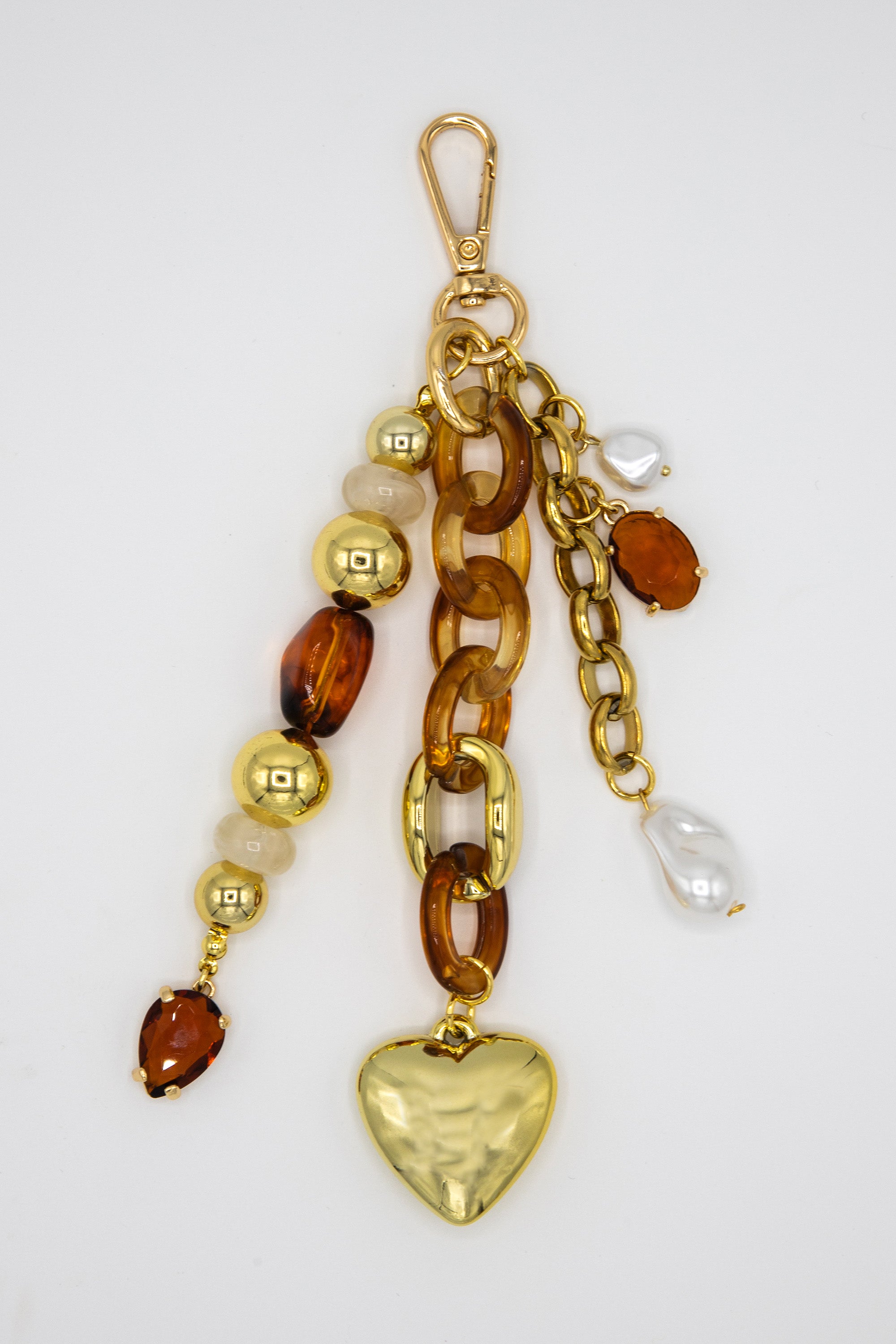 Elevate your style with the Amber Gaze Bag Chain, where luxe meets playful charm. Featuring a rich tortoise chain intertwined with gleaming gold-toned hardware, a big gold heart, lustrous pearls, and warm brown beads and charms, this accessory adds a touch of sparkle and sophistication to any bag. Perfect for those who love a blend of elegance and fun in their everyday look.