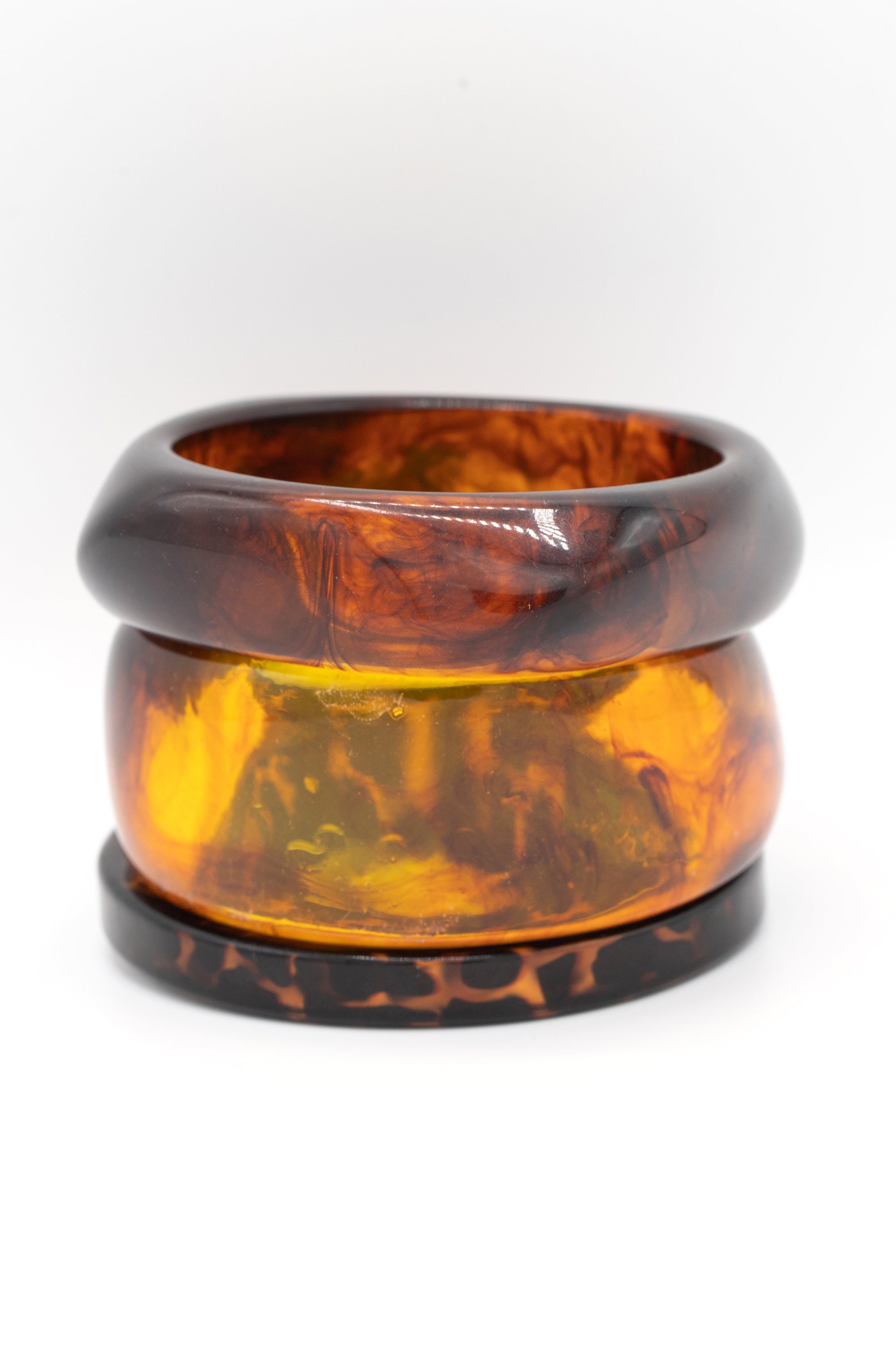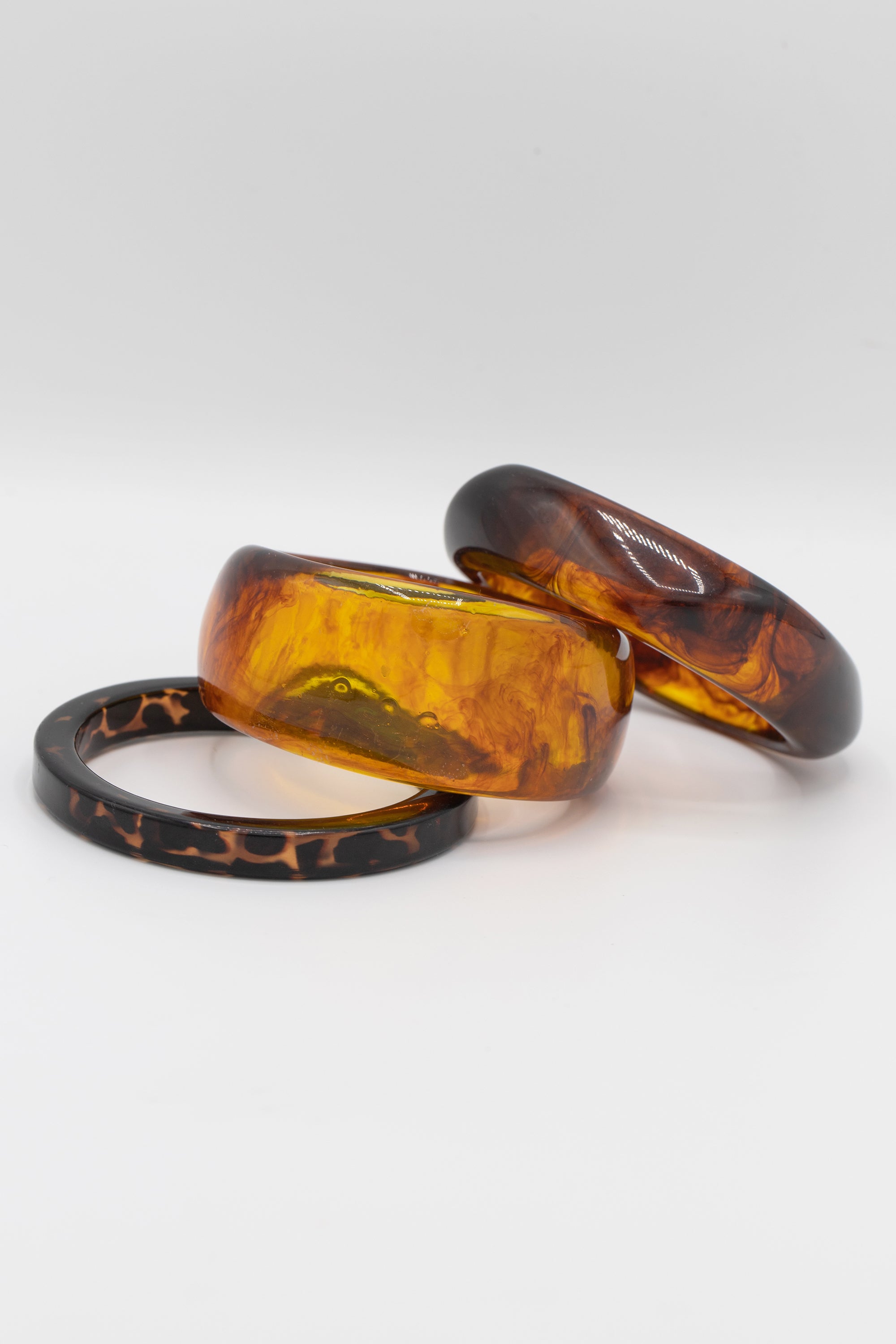 Add a splash of vintage charm to your look with the Amber Noir Bangle Set. This playful trio of resin bangles showcases swirling shades of deep amber, honey, and espresso, capturing the classic tortoiseshell vibe with a fun, modern twist. Perfect for stacking or wearing solo, these bangles bring timeless elegance and a pop of color to any outfit.