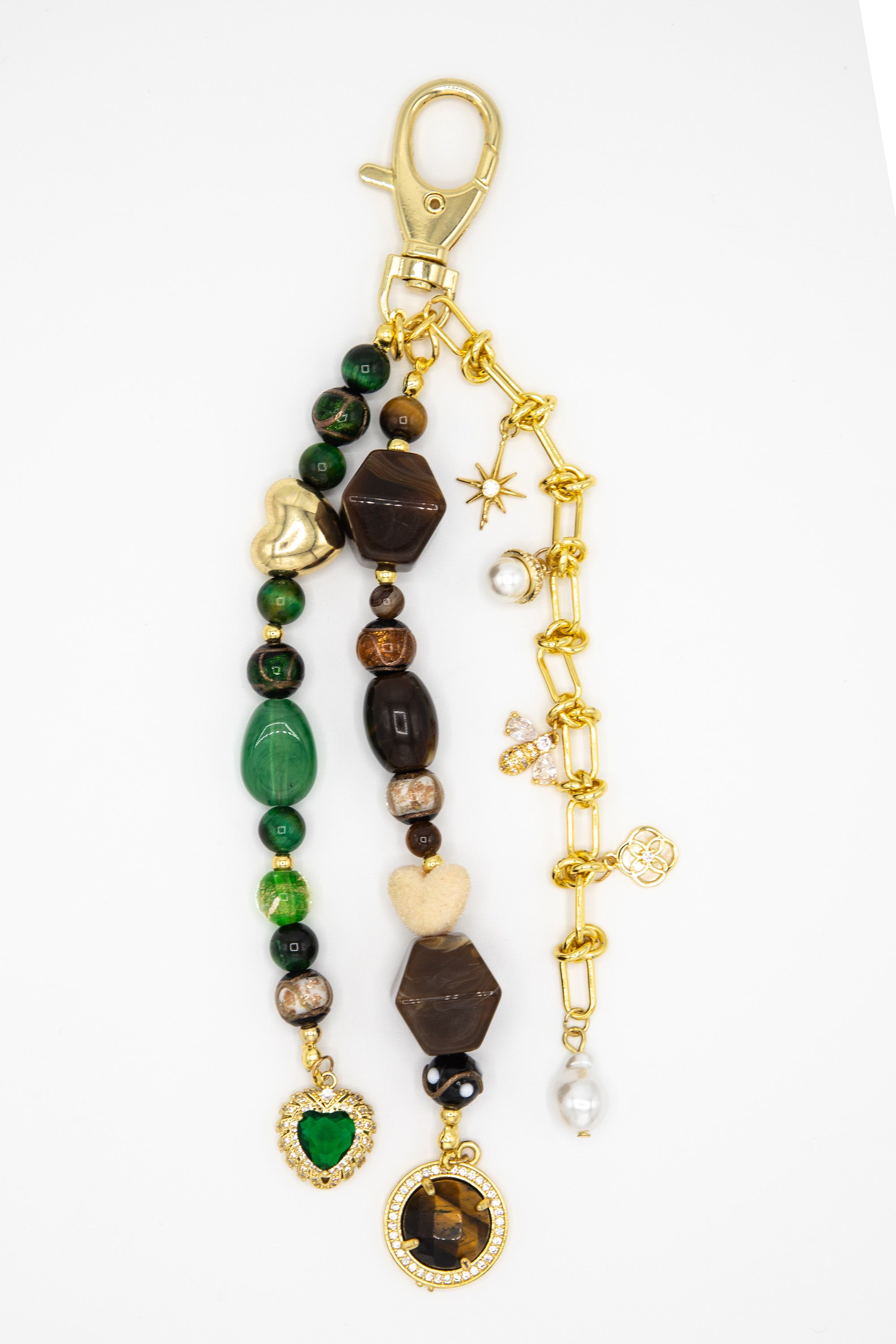 Embrace your inner nature goddess with the Bee Magic Bag Chain, a playful blend of earthy greens, rich browns, and shimmering tiger’s eye. Accented with golden stars and hearts, and delicate pearls, this chain adds a cosmic charm and vintage glam touch to any bag. Let your style buzz with bold, mystical energy wherever you go!