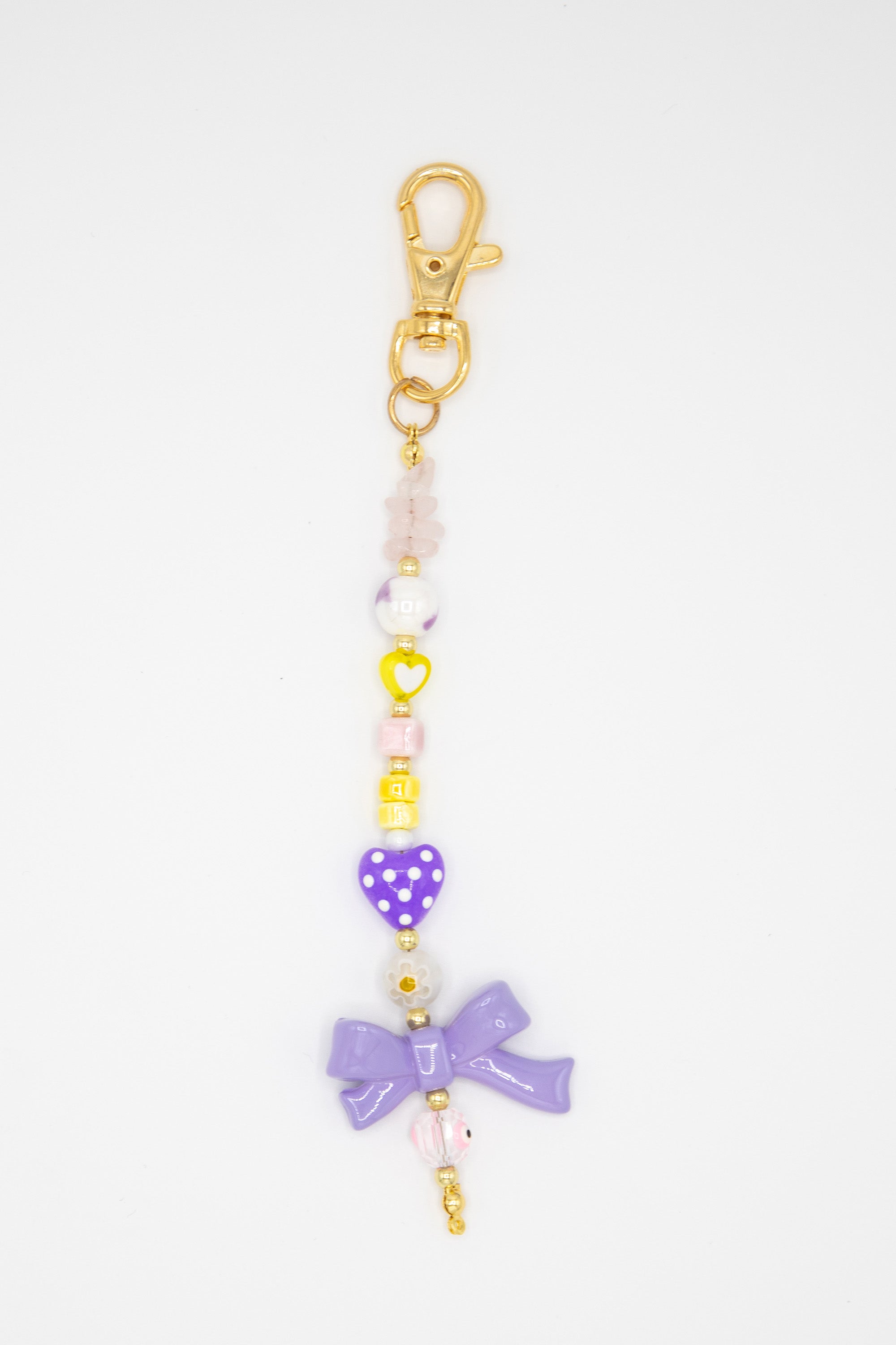 Add a touch of whimsy to your bag with this playful gold-tone charm featuring a simple polka dot heart and a delicate lavender bow. Perfect for brightening up any handbag or backpack with a fun, stylish accent.
