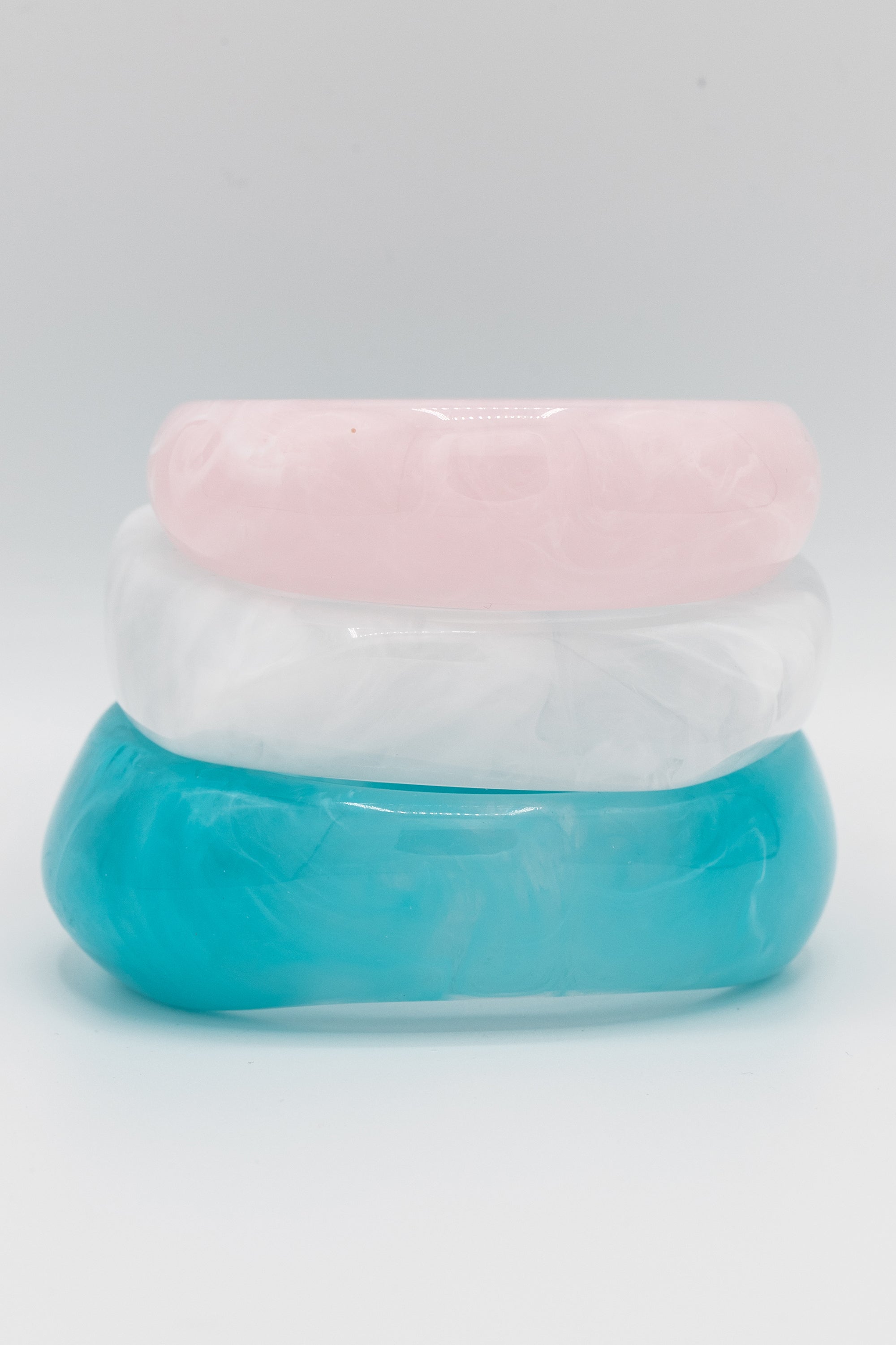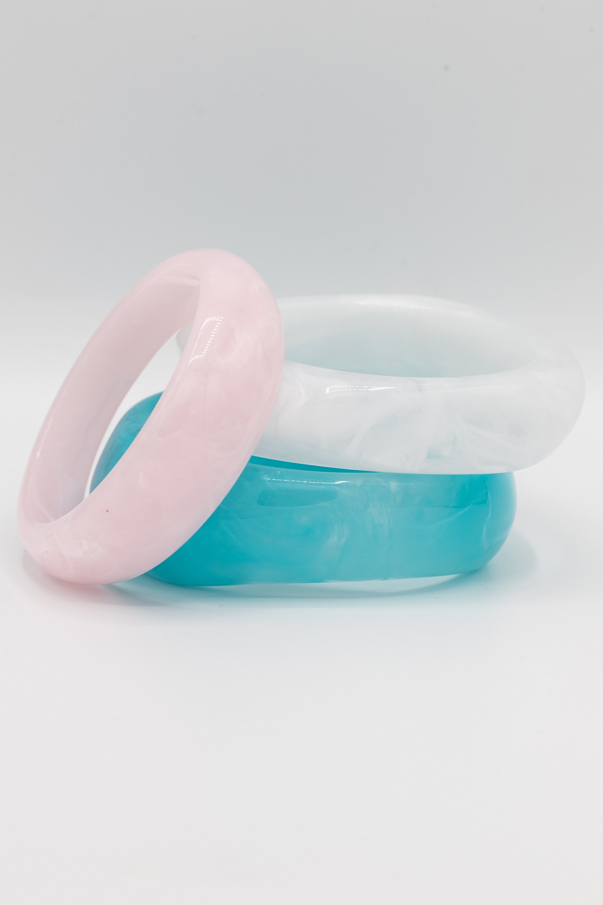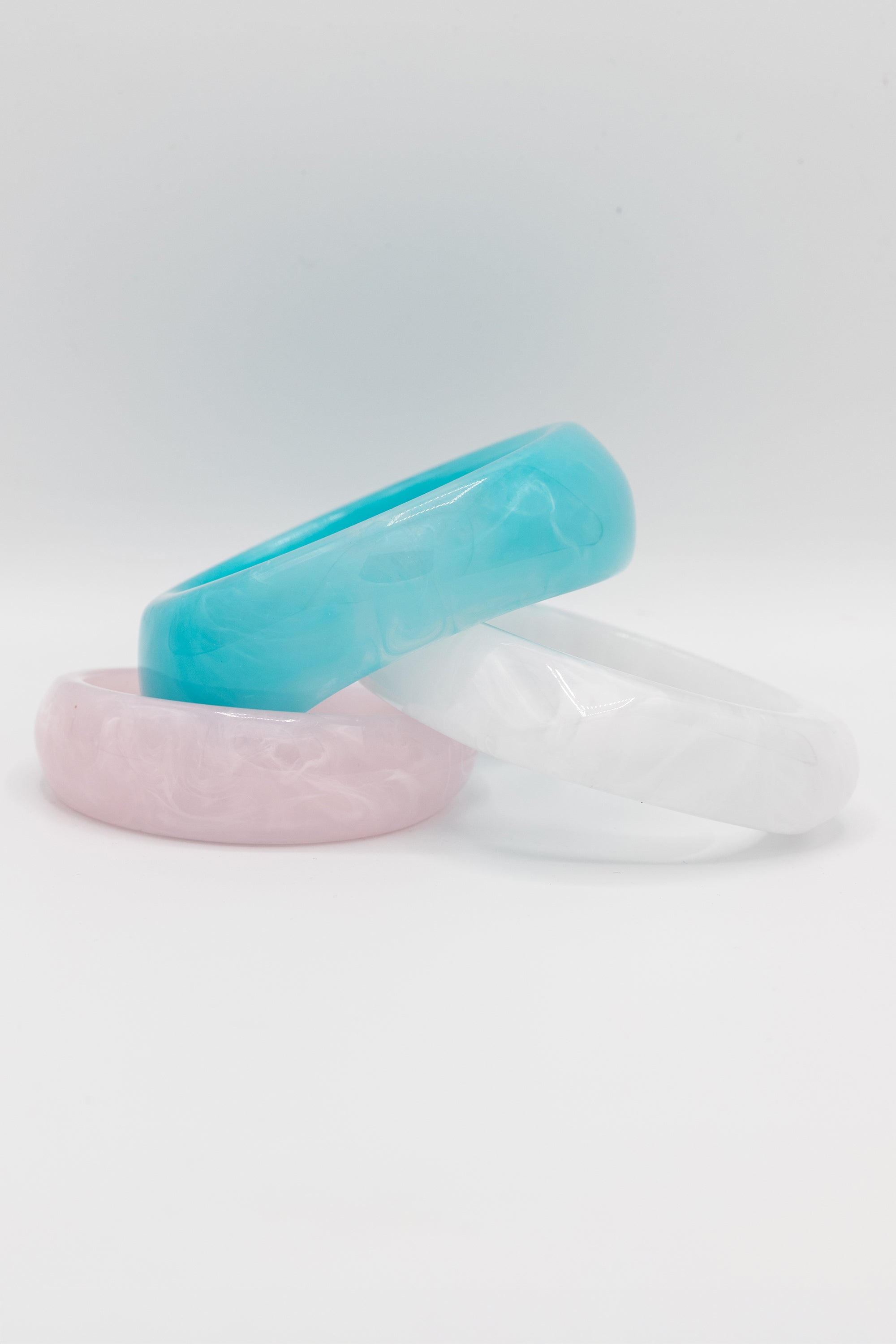 Add a splash of whimsy to your look with this Candy Coated Bangle Set. Featuring dreamy pastel shades of baby pink, milky white, and aqua blue, these resin bangles bring sweet, serene, and retro charm to any outfit. Perfect for stacking or wearing solo, they’re a playful way to brighten your day.