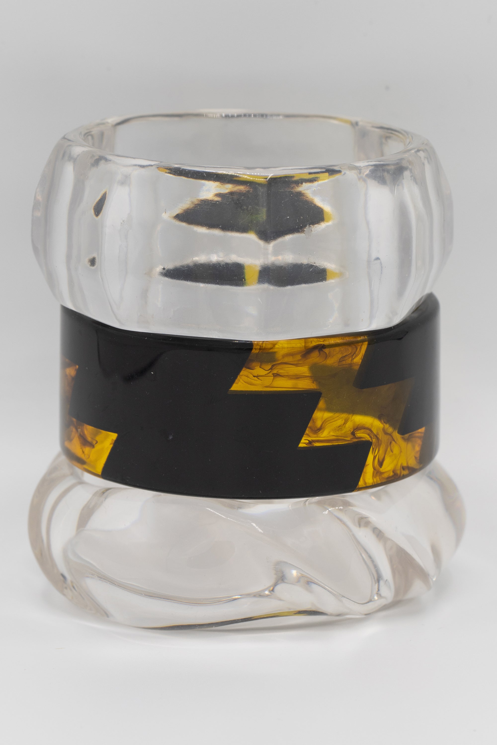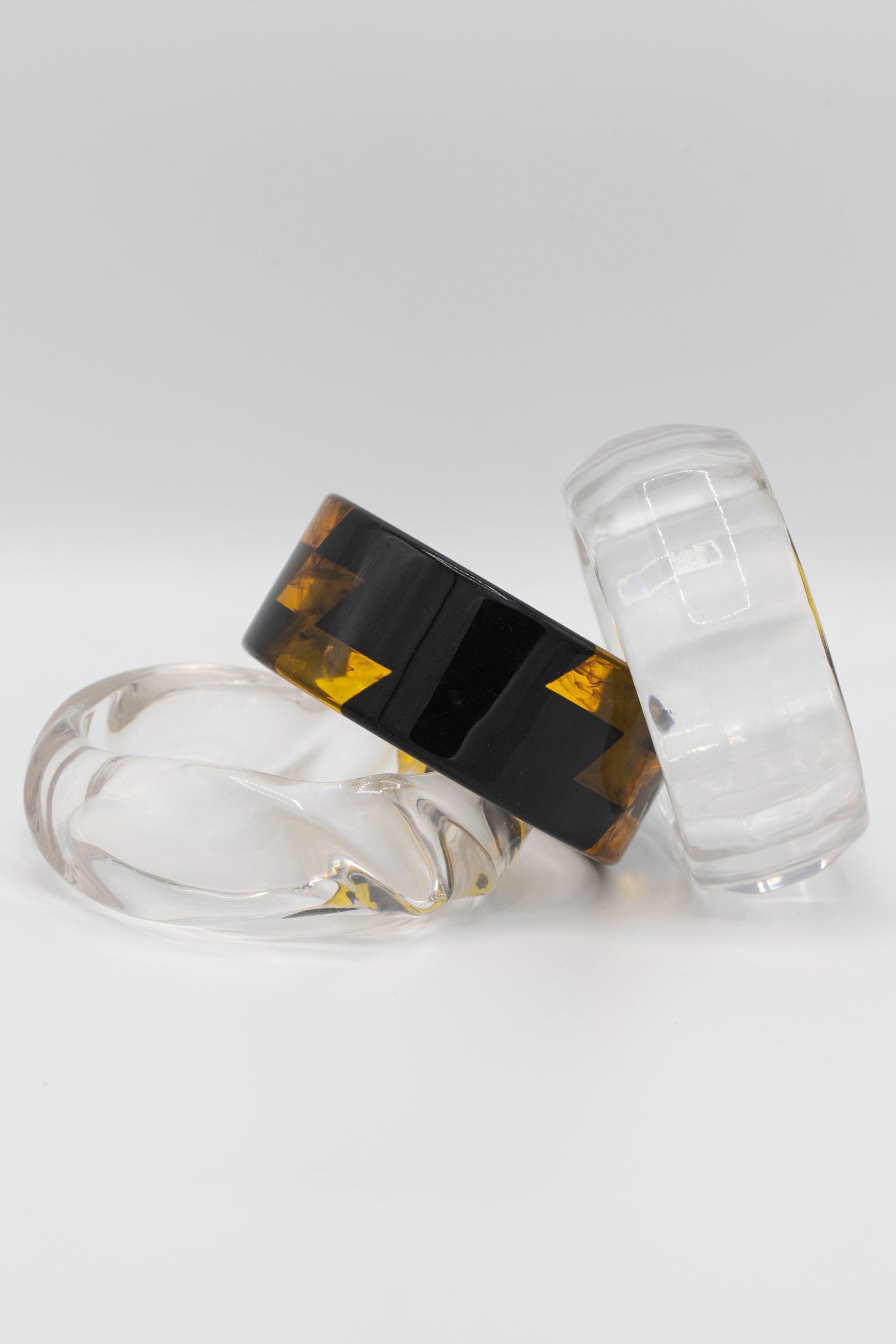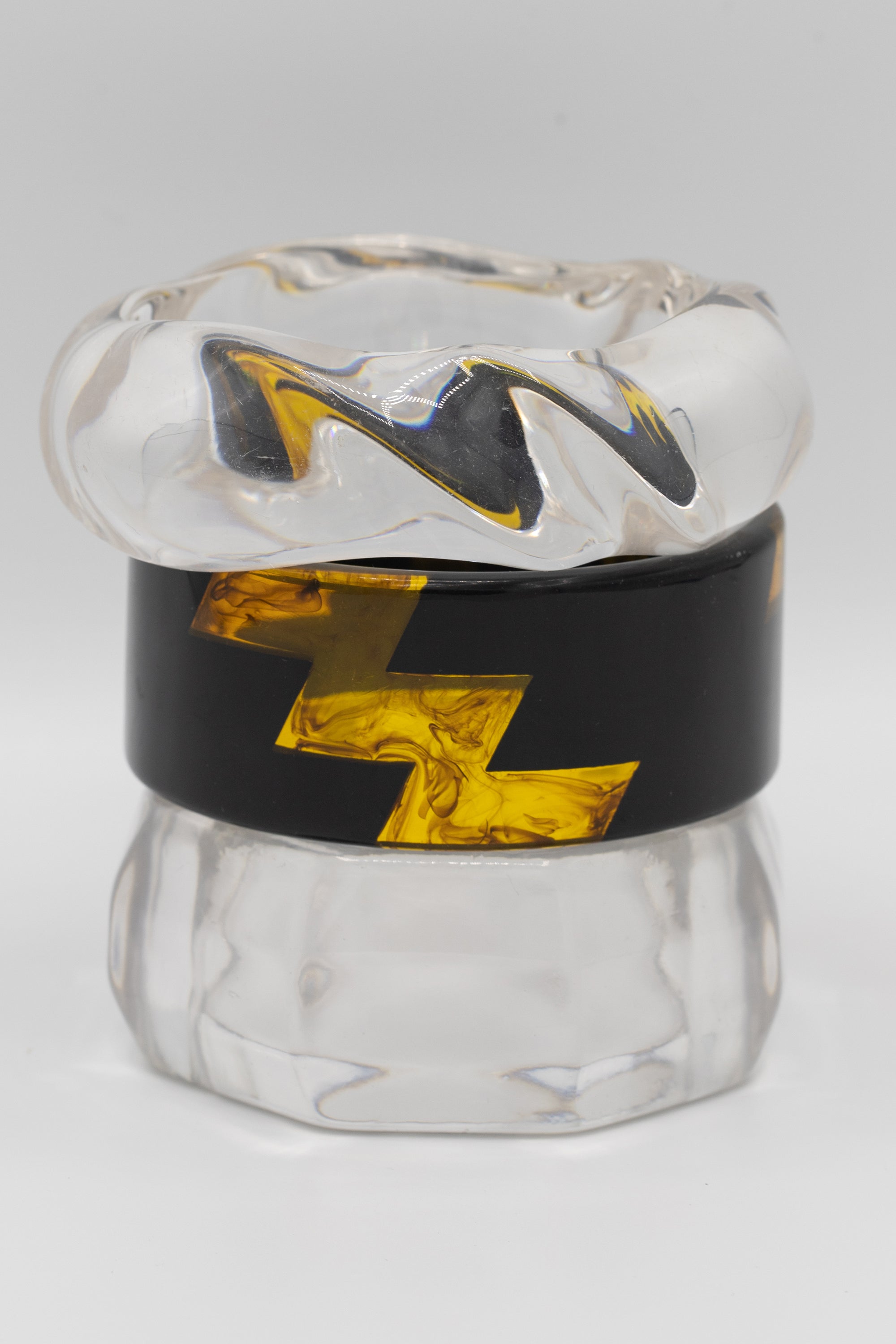 Add a splash of fun to your look with the Crystal Current Bangle Set. These playful bangles mix clear sculptural resin with bold black and amber zigzags, creating a striking contrast that catches the eye. Perfect for stacking or wearing solo, they bring a lively, artistic vibe to any outfit.
