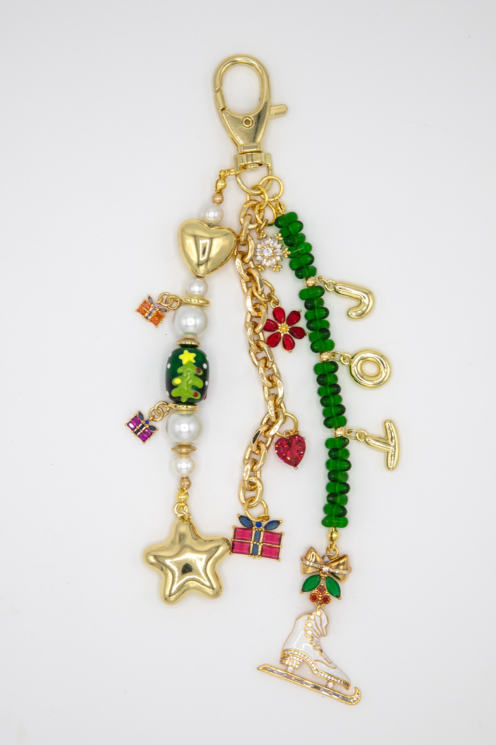 Celebrate the season with the Ice Capade Bag Chain, a playful accessory that brings holiday cheer to your style. Featuring charming Christmas ice skates, bubbly JOY letters, and classic festive charms like flowers, stars, hearts, and presents, all accented with gleaming gold hardware. This whimsical chain adds a sparkling touch of nostalgia and fun to any bag, perfect for spreading joyful vibes wherever you go.
