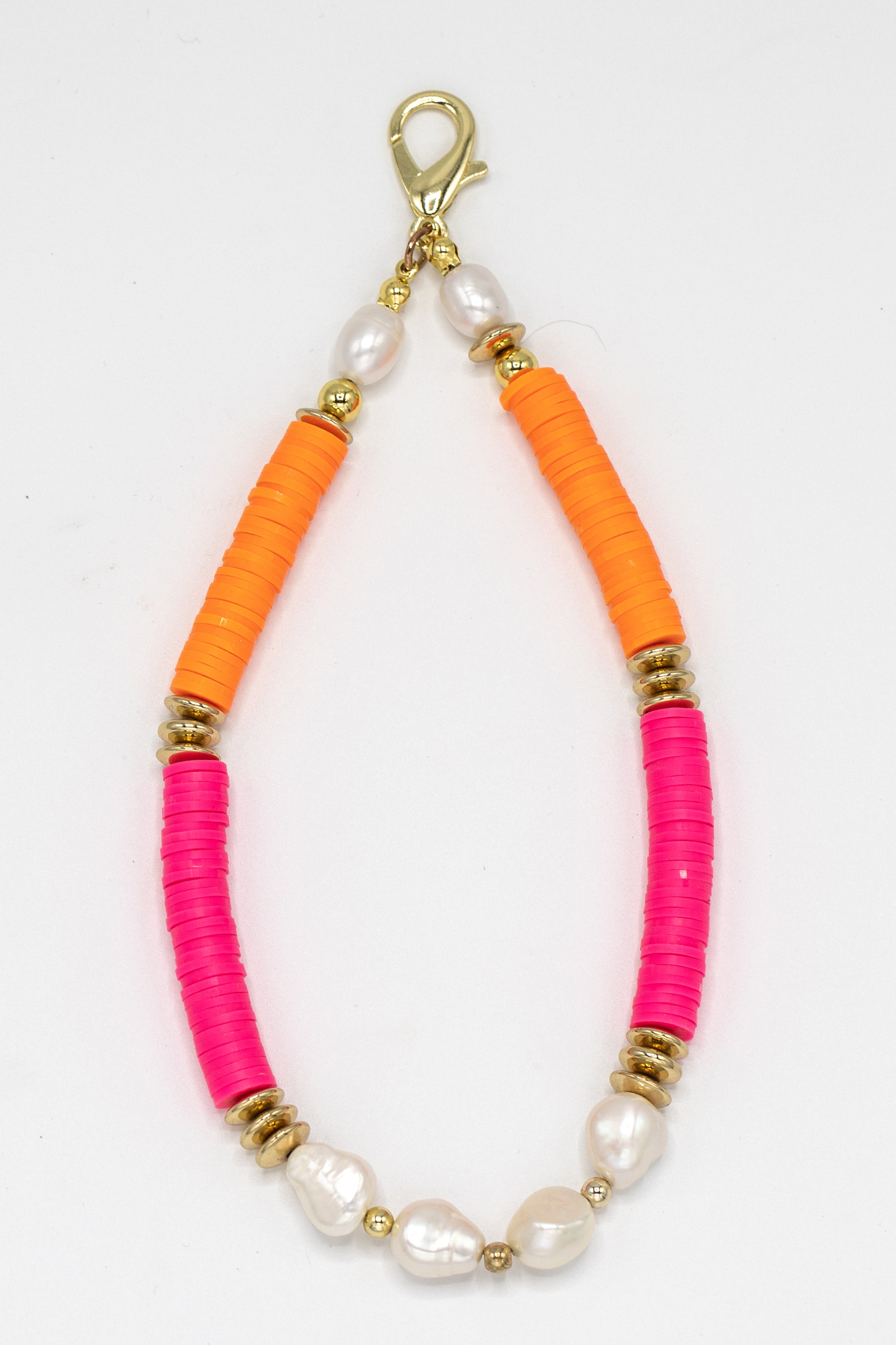 A juicy splash of neon meets beachy elegance in this one-of-a-kind phone wristlet. With hot pink and zesty orange heishi beads paired with luminous freshwater pearls and golden accents, this piece radiates vacation vibes 24/7. Clip it on for a playful pop of color, it's your new favorite arm party and phone holder in one. 🍊💖✨