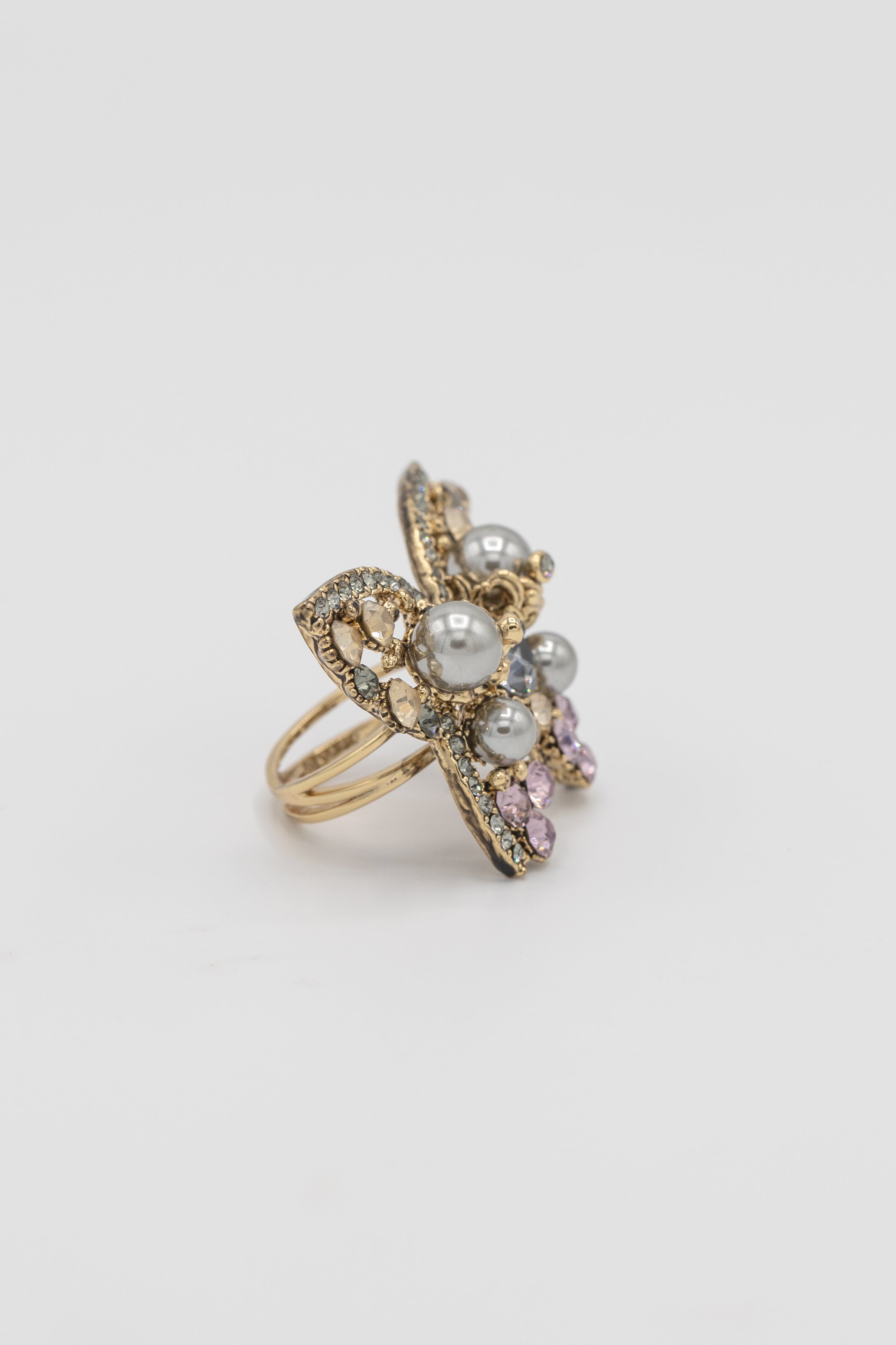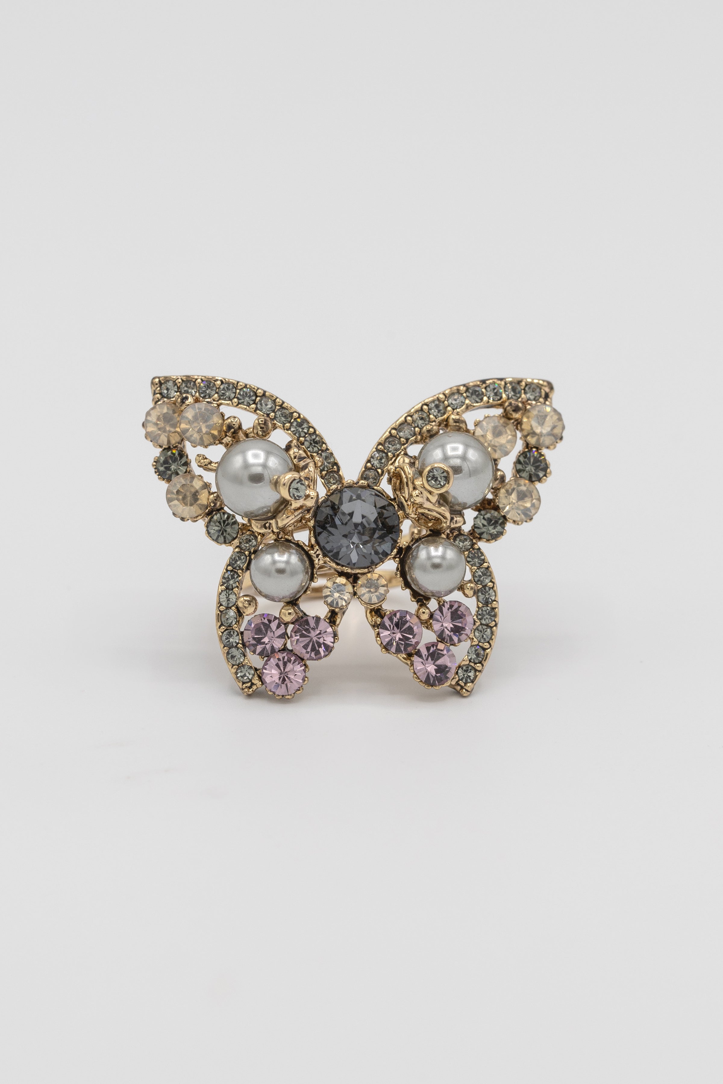 The whimsical Gilded Wings Ring shimmers with a mix of soft champagne, smoky, and blush pink crystals. Accented by luminous faux pearls and set in warm bronze-tone metal, this piece captures the magic of a twilight garden—delicate, dreamy, and made to make your style take flight.