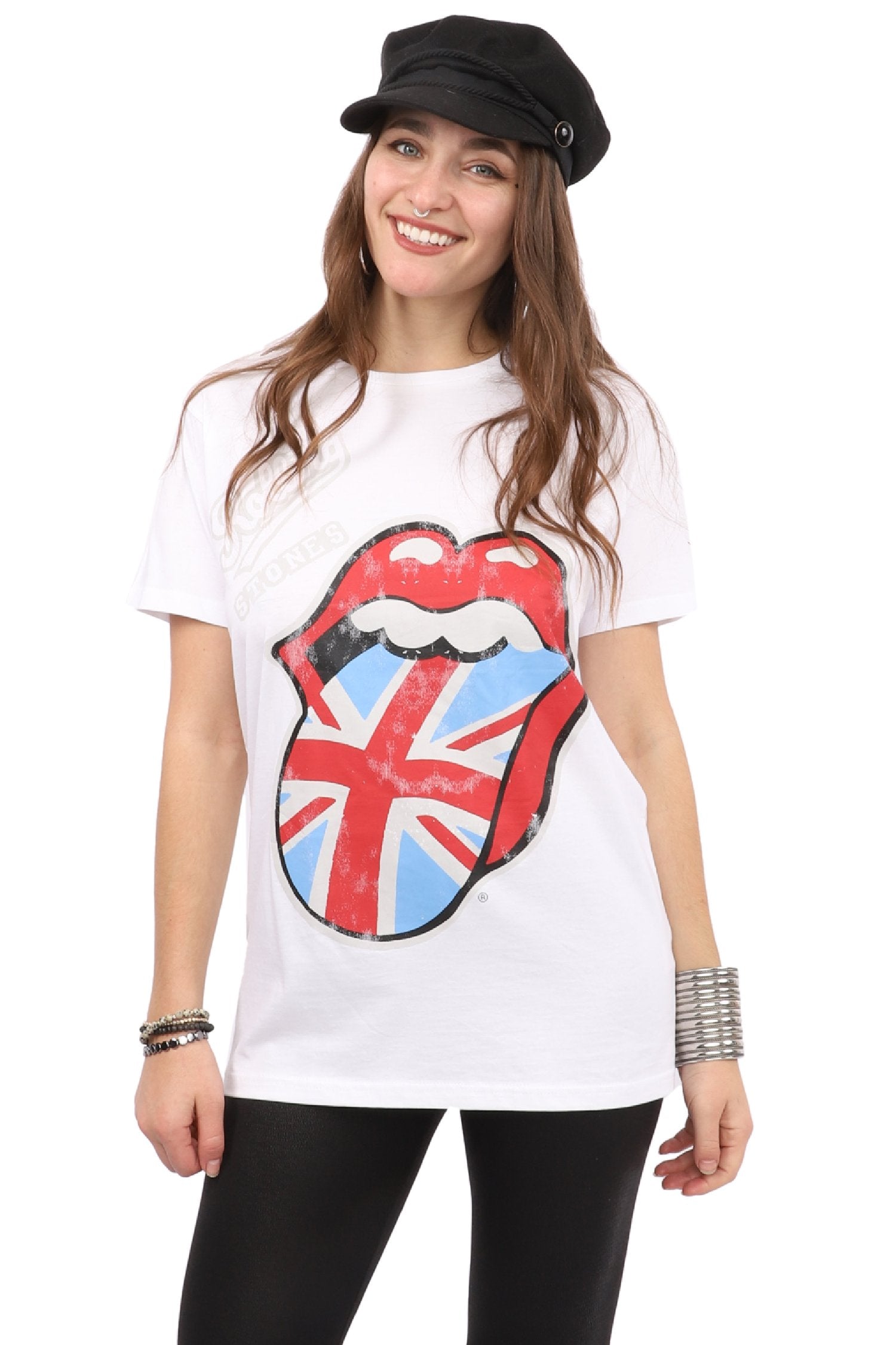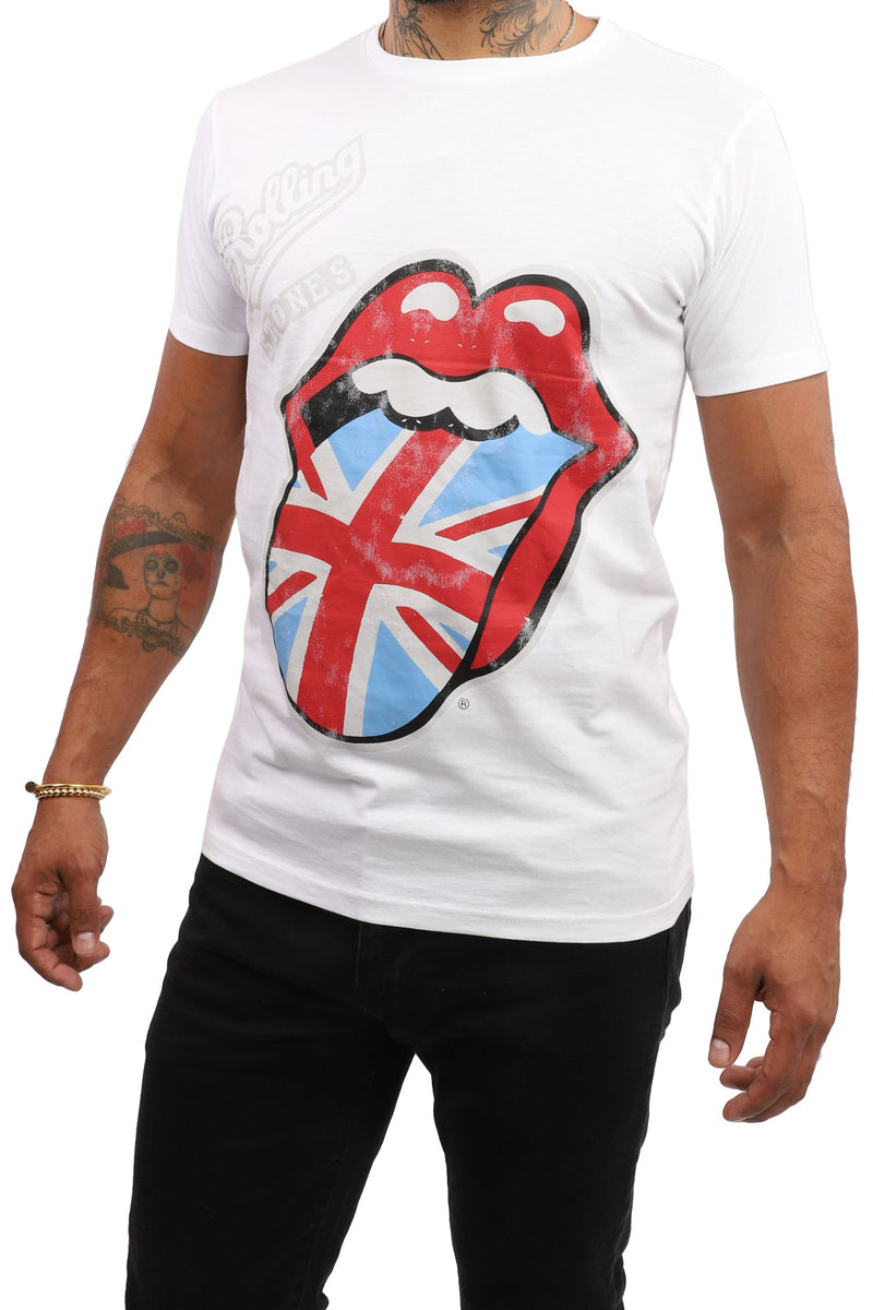 Official licensed Rolling Stones tee with iconic tongue logo with UK flag design.