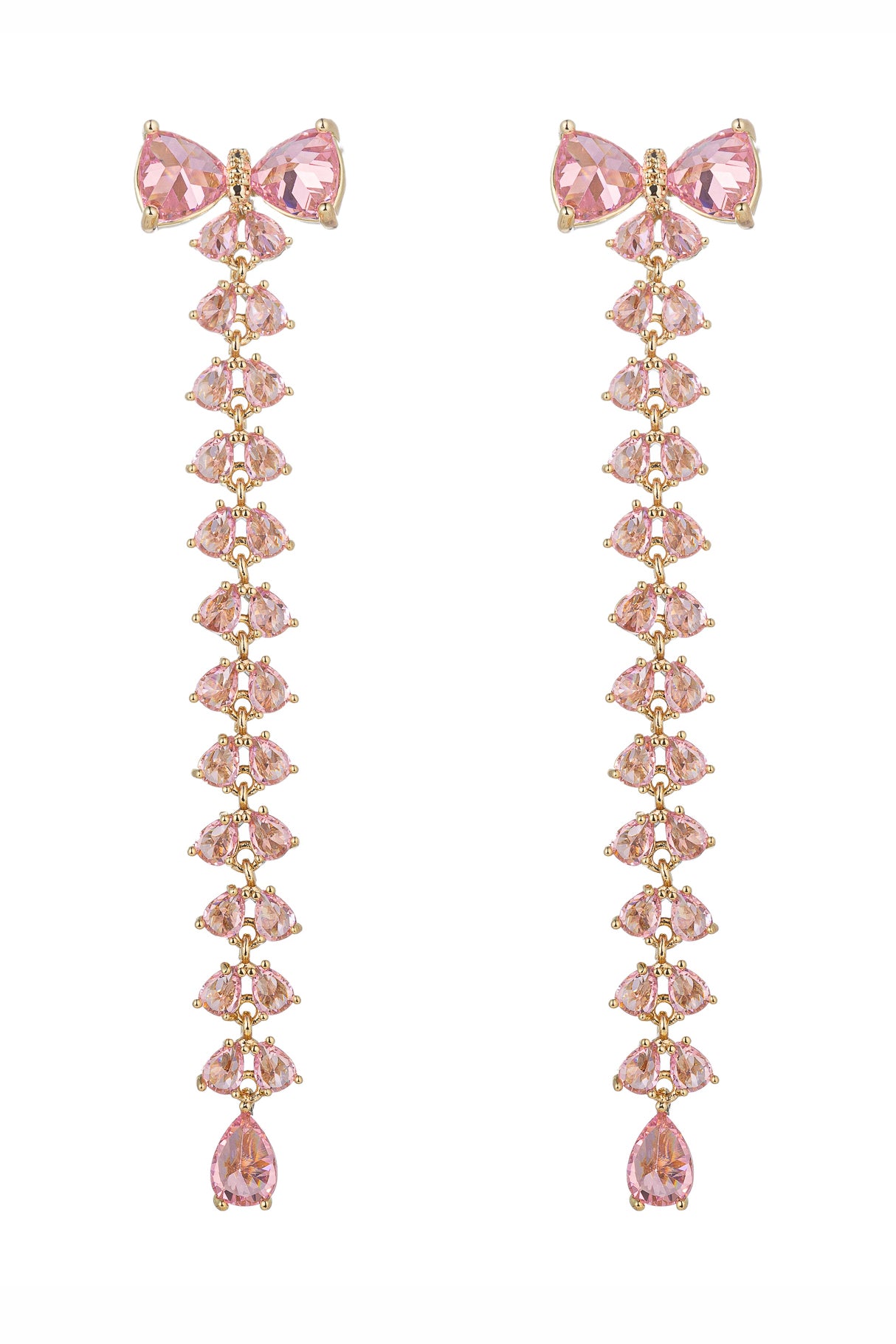 Garner a new glamourous look with these bright pink bow earrings! These bow earrings boast shining pink zirconia crystals that are further complimented by a gold brass base to really let their beauty shine through. Pair these long earrings with a gold necklace to complete the jewelry set!